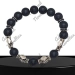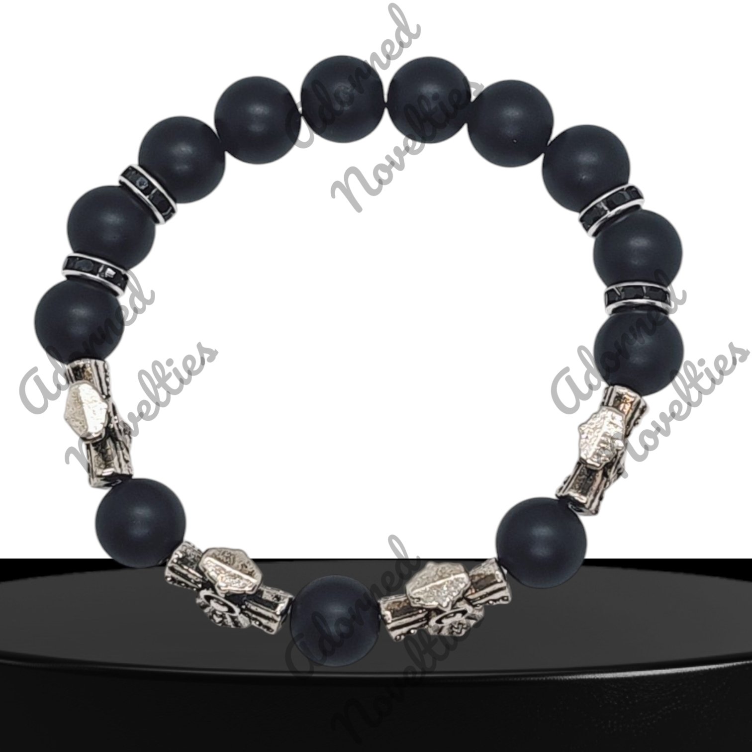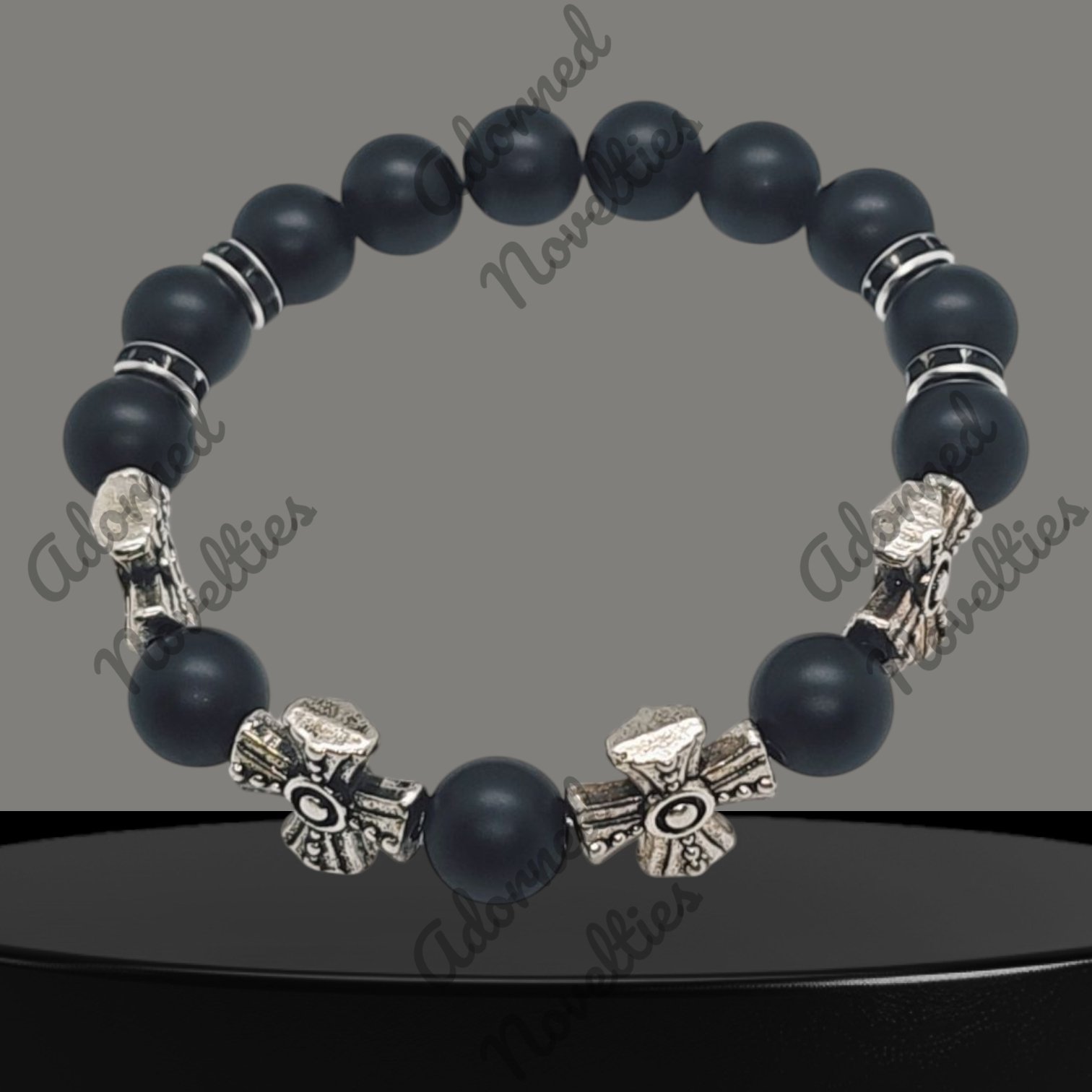 Natural Black Onyx Gemstone 10mm beads accented with Iron Cross spacers. Bracelet is 7 inches