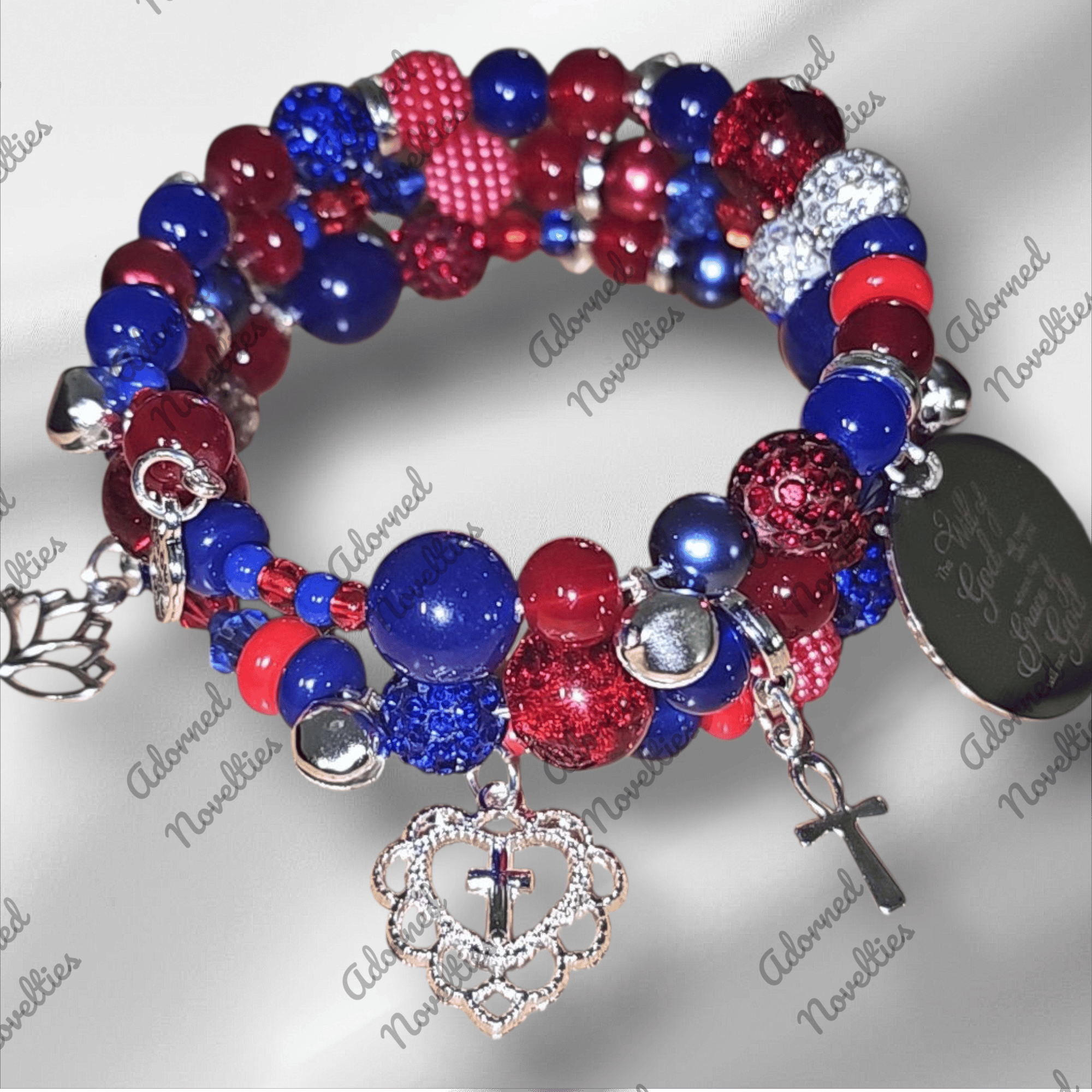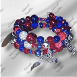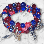 Royal blue and shades of red acrylic round and rondelle, rhinestone, and stone beads on a silver base loaded with silver charms.