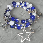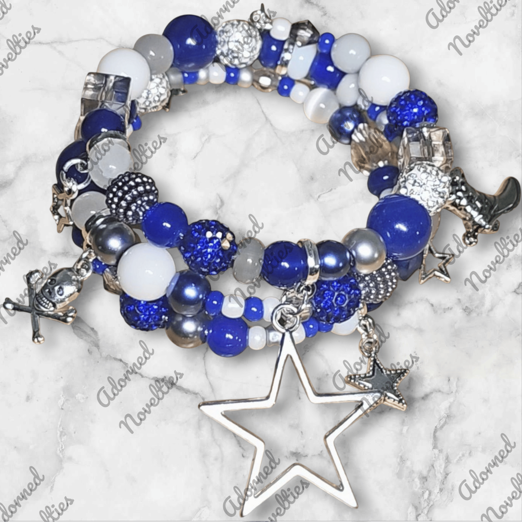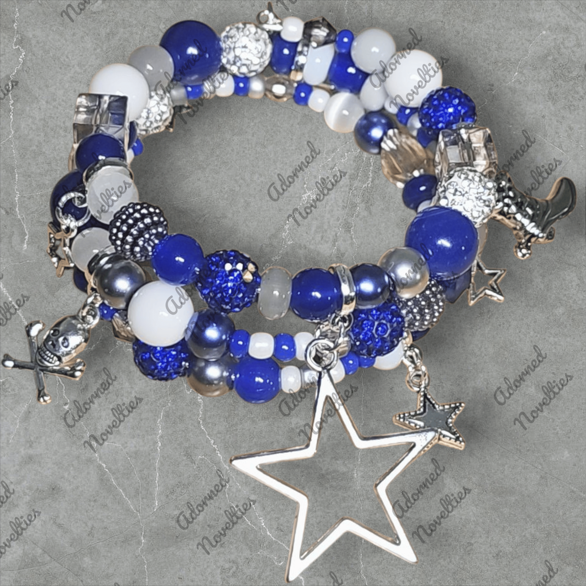 Blue, Grey, white round, rondelle, rhinestone, seed, acrylic, and stone beads on a silver base loaded with silver charms.