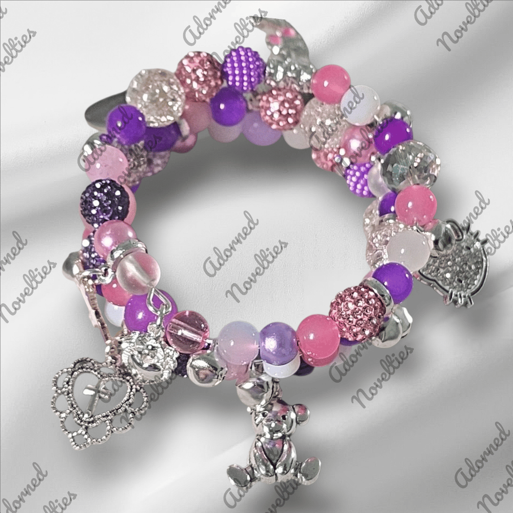 Shades of purple and shades of pink roun and rhinestone beads on a silver base loaded with silver charms.