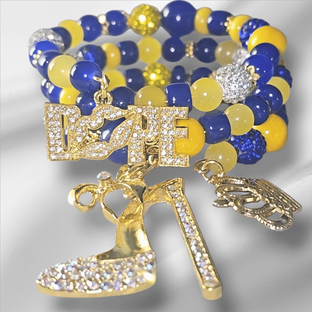Yellow and blue rondelle, round and rhinestone beads on a gold metal base with bling charms.