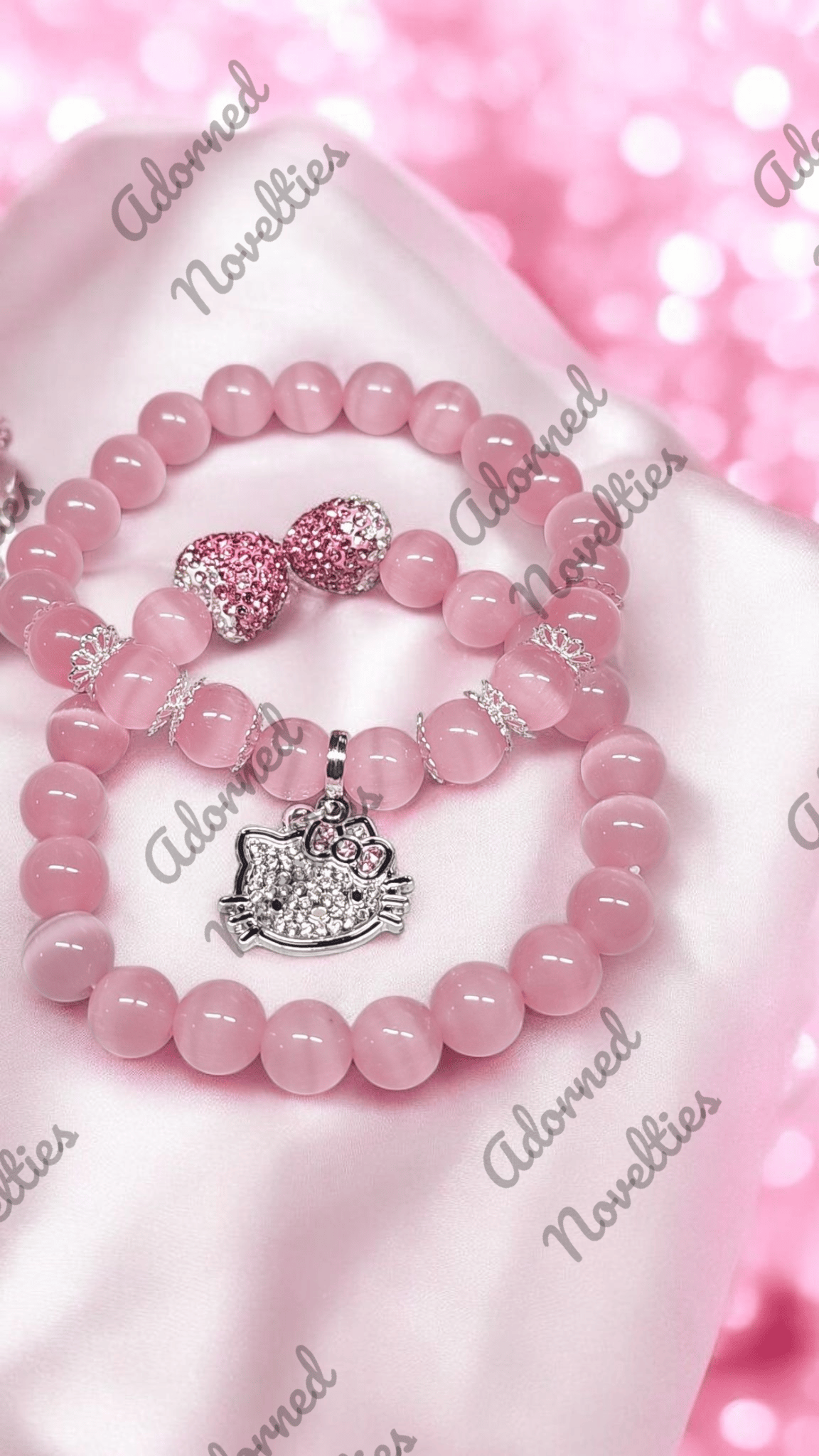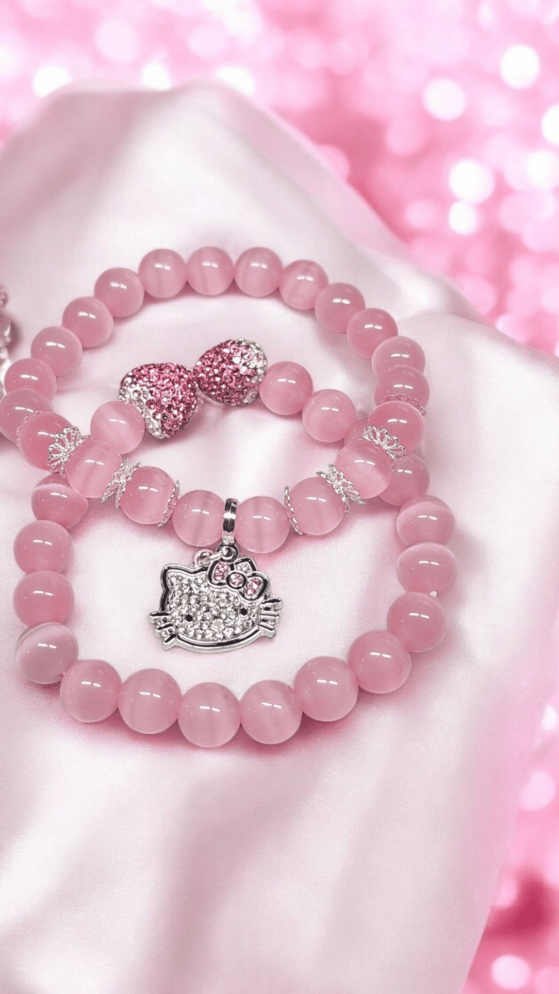 Bracelet set handmade using 10mm pink Cat Eyes beads with rhinestone heart beads, silver accent spacers, and a cat charm.