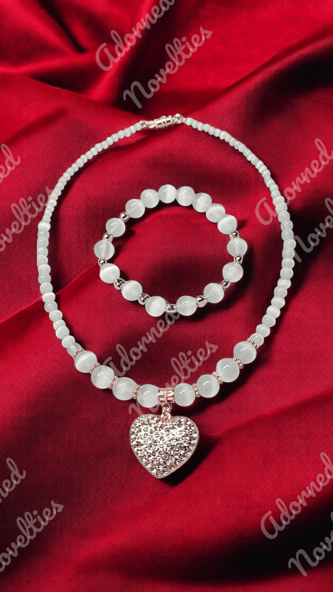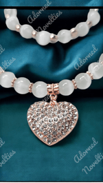 Necklace and bracelet set handmade using 4,6 and 8mm white cat eye stones accented with rose gold spacers and a rhinestone heart charm.