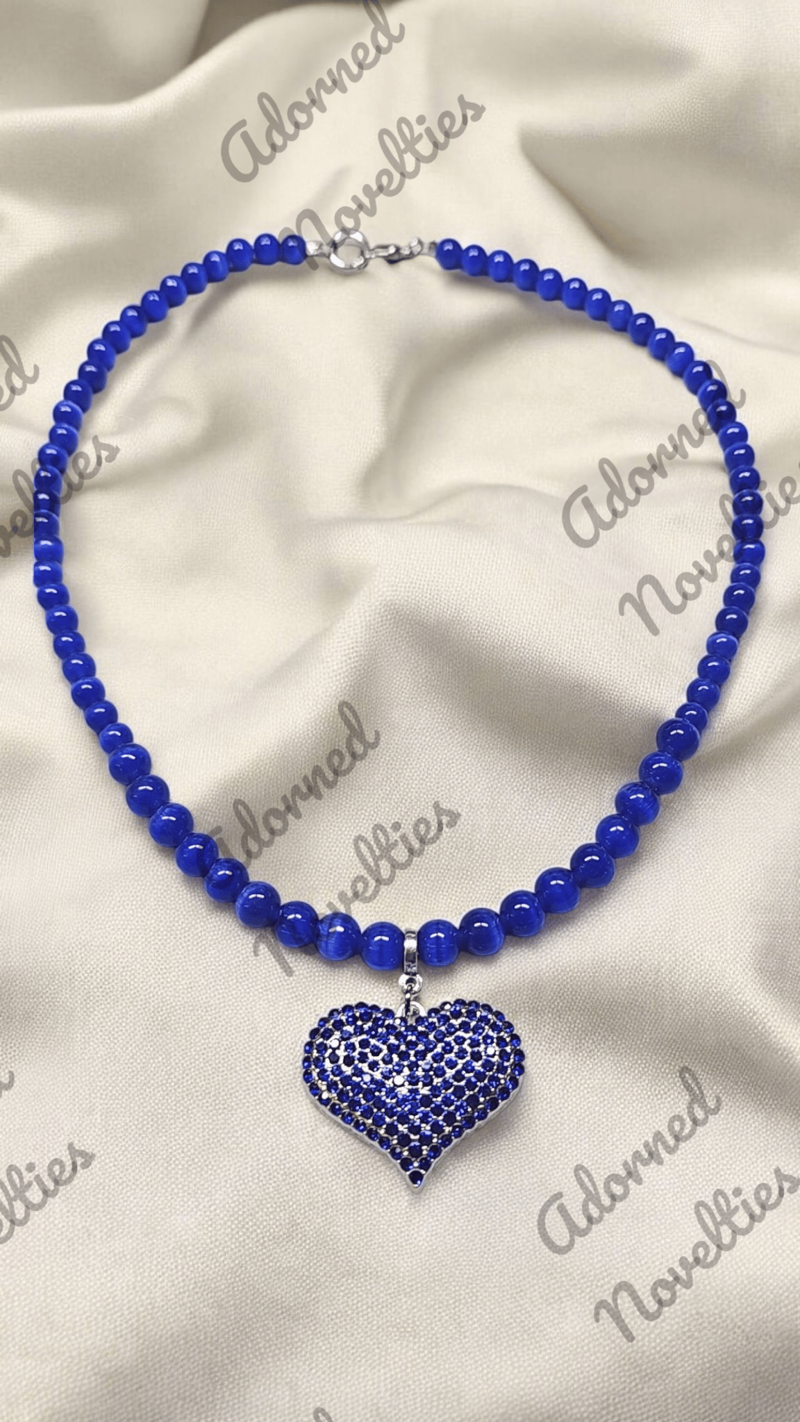 Necklace handmade using blue cat eye beads with silver accents and blue rhinestone heart pendant.