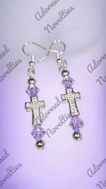 Earrings - glass faceted purple beads accented with a silver cross and round spacer beads