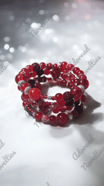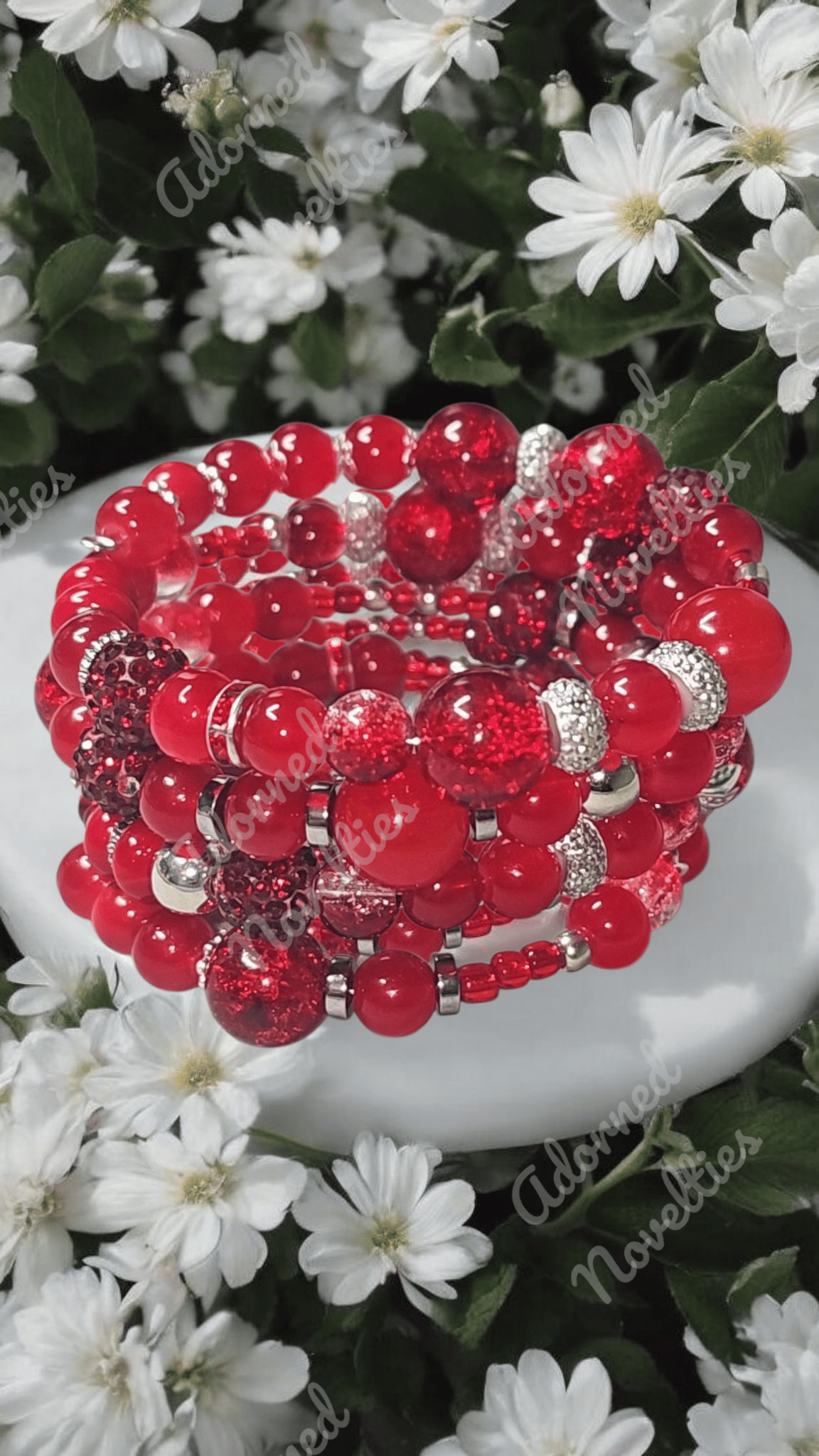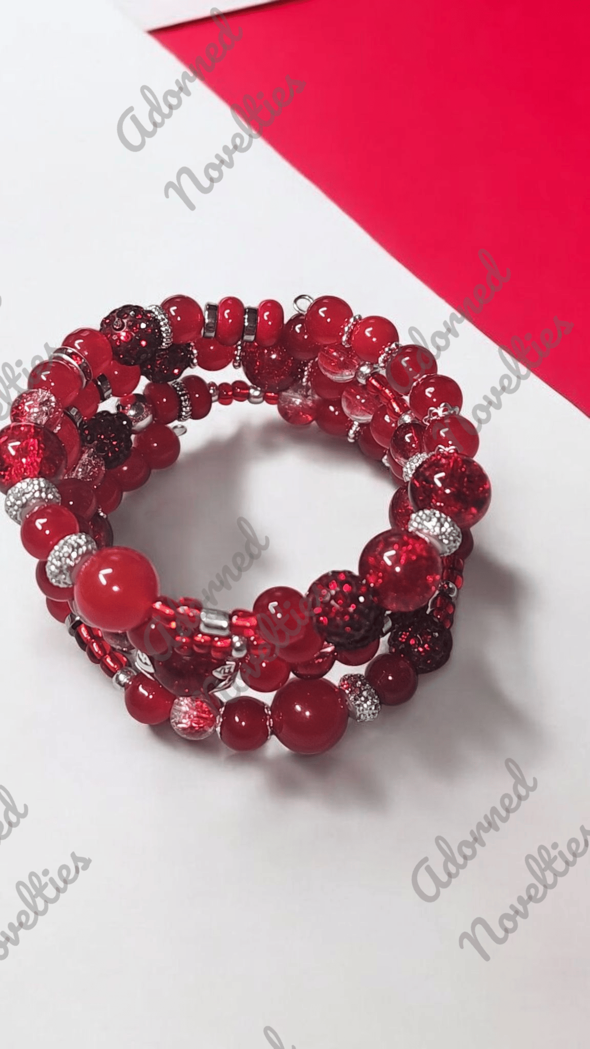 Handmade bracelet created using silver memory wire, various shades of red and silver glass and rhinestone beads.