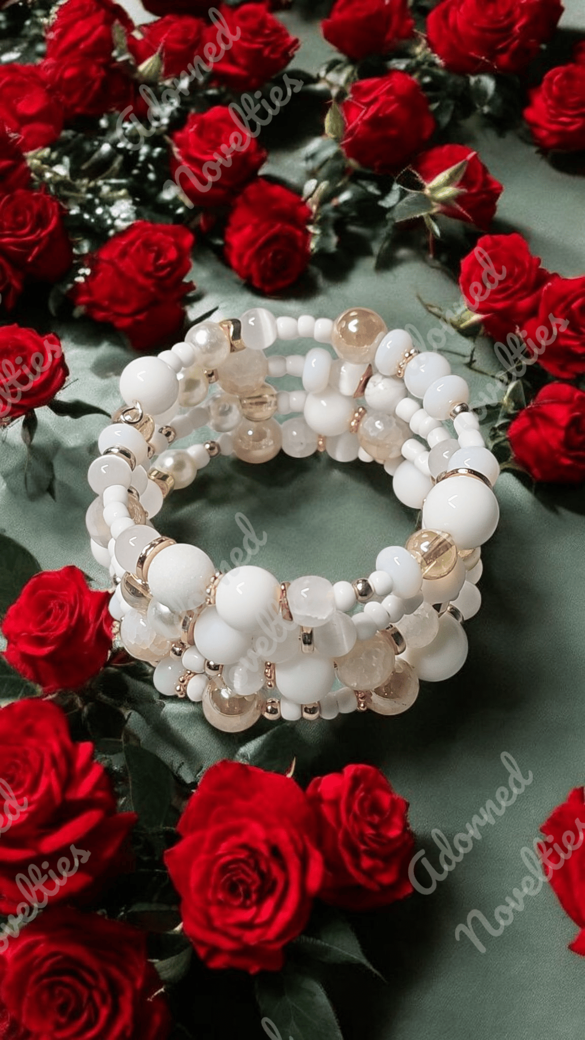 Handmade bracelet created using rose gold memory wire, various types of white beads accented with rose gold spacers.