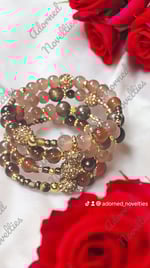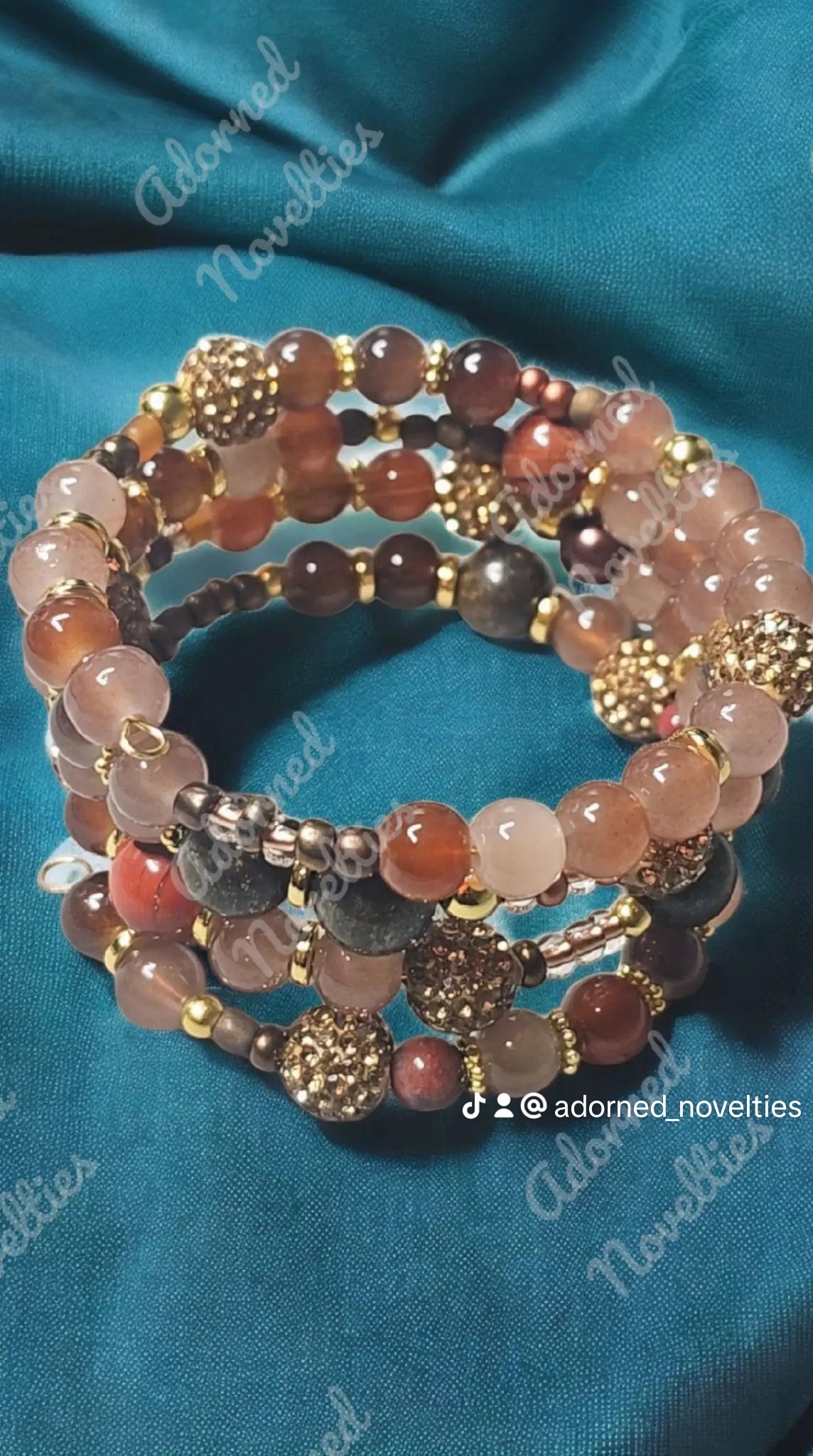 Handmade bracelet created using gold memory wire various shades of brown glass, stone, rhinestone, and seed beads accented with gold spacer beads.
