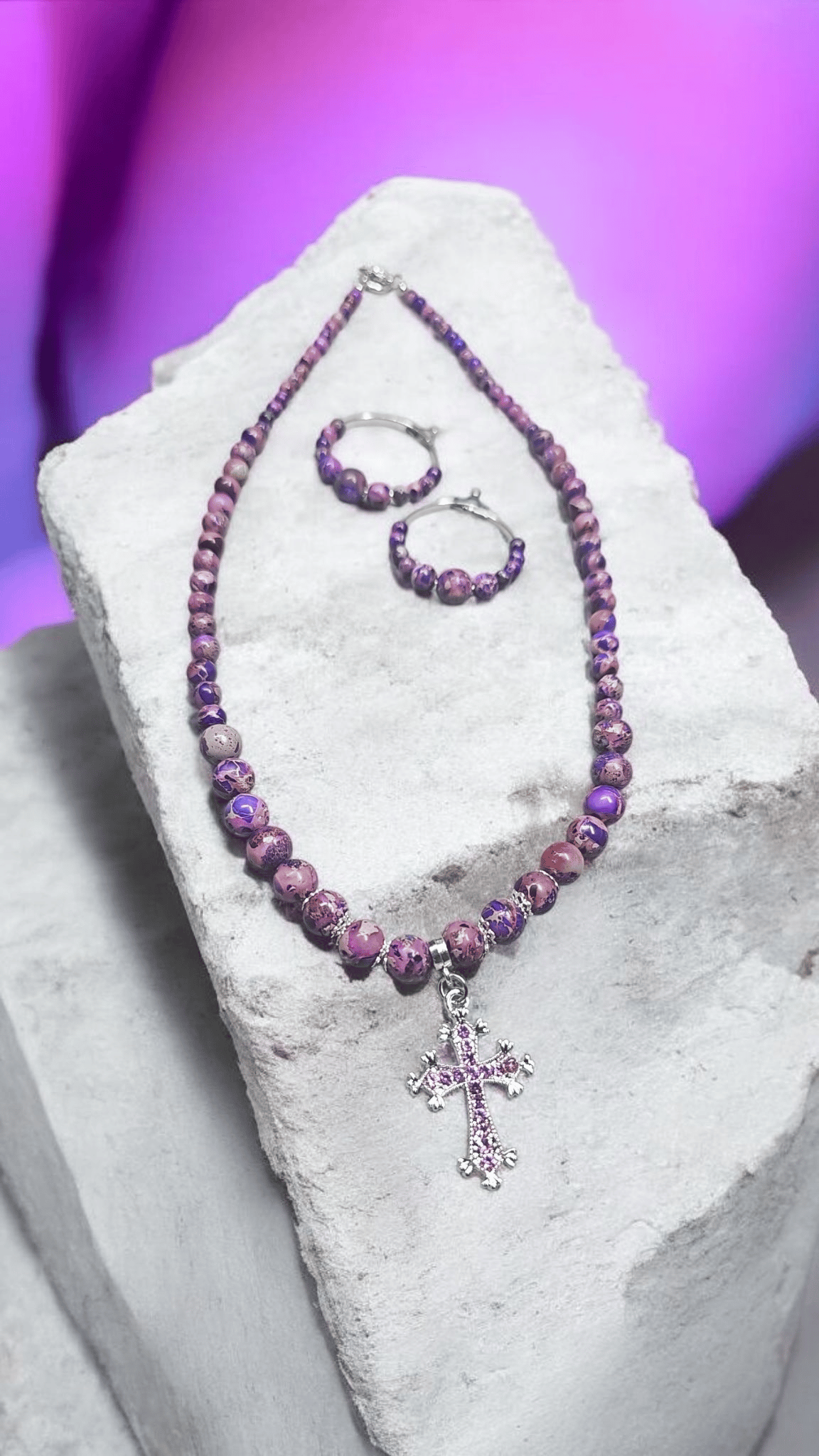 Handmade necklace and earring set created using imperial jasper beads with silver accents and purple cross charm.