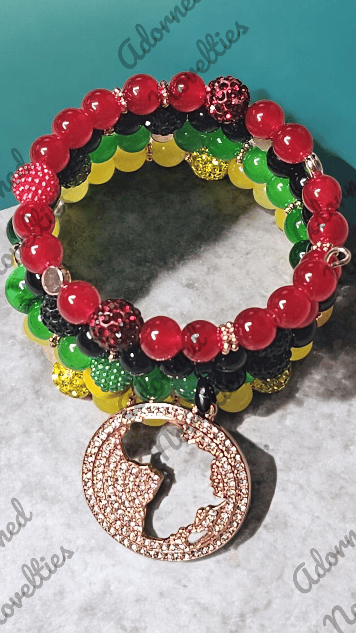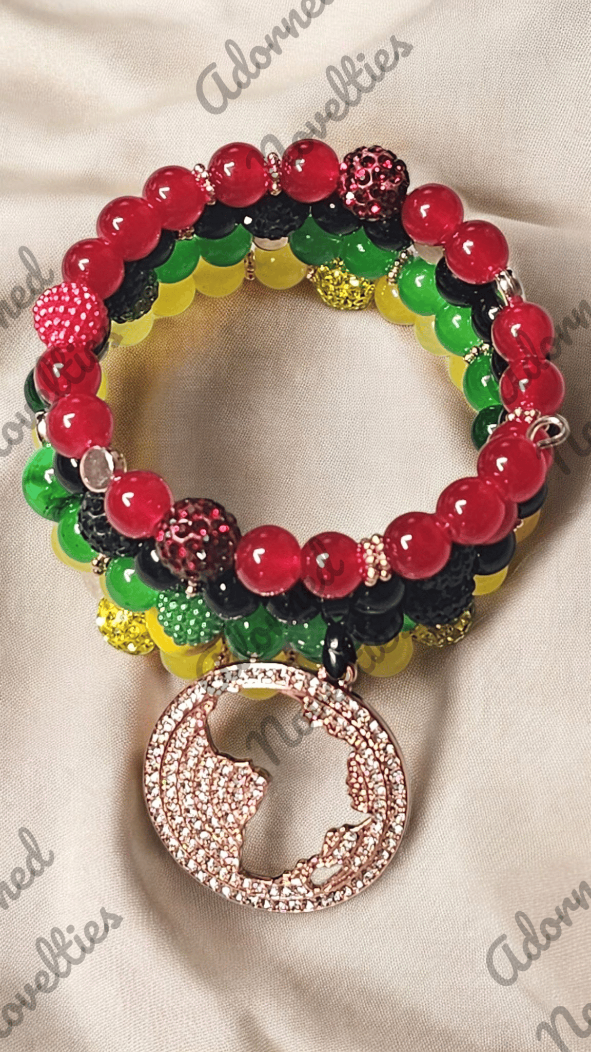 Handmade bracelet created using rose gold memory wire red, black, green and yellow glass, and rhinestone beads accented with rose gold spacer beads accompanied by a rose gold rhinestone charm.