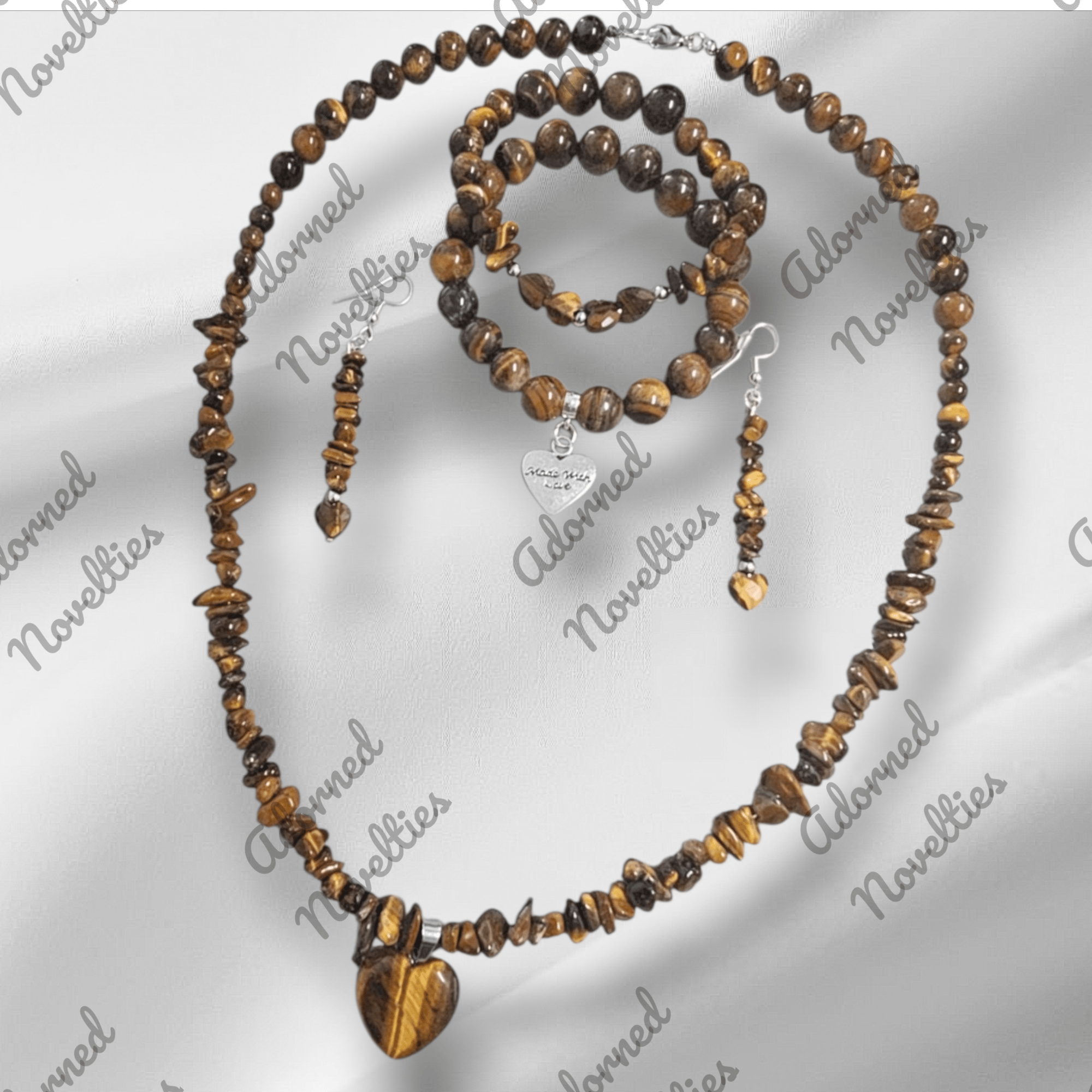 Tiger Eye elastic bracelets handmade with round, chipped, heart-shaped tiger-eye stones and silver accent beads and heart pendant.